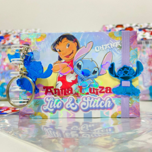 Kit 10 Lembrancinha Lilo & Stitch | Mini Livro A7 + Chaveiro Personalizado