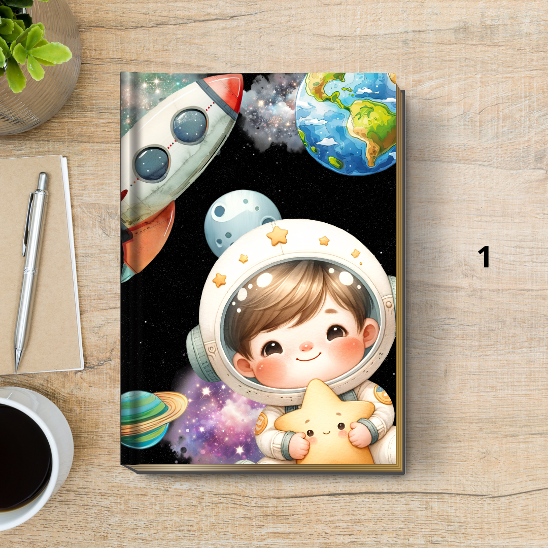 4 Opções de Capa: Escolha a arte que mais combina com seu pequeno astronauta (duas opções com fundo escuro/galáxia e duas com fundo claro).