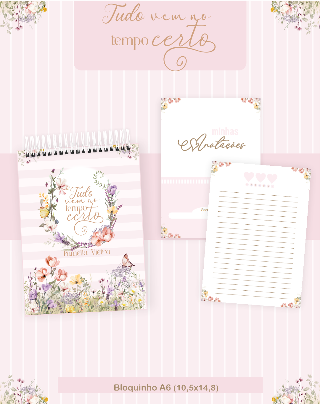 Esta nova coleção é um verdadeiro convite à paciência e ao florescer pessoal. Com uma estética romântica e serena, a linha “Tempo Certo” combina um fundo listrado clássico em tons de lilás e off-white com a beleza de um jardim silvestre, trazendo a mensagem reconfortante: “Tudo vem no tempo certo”.