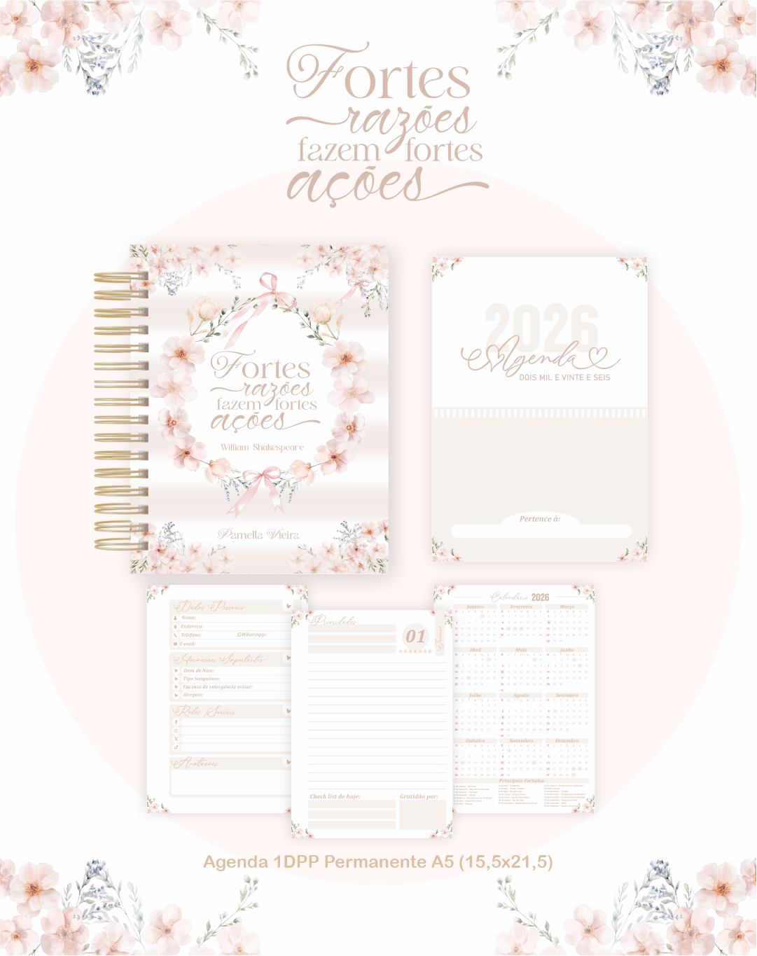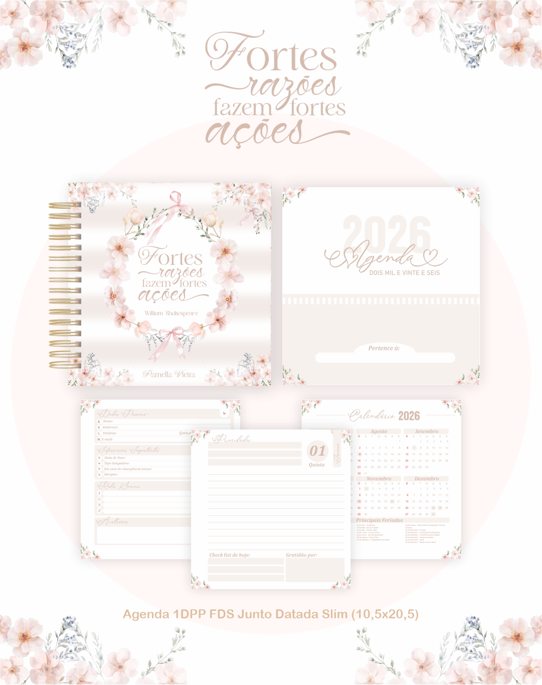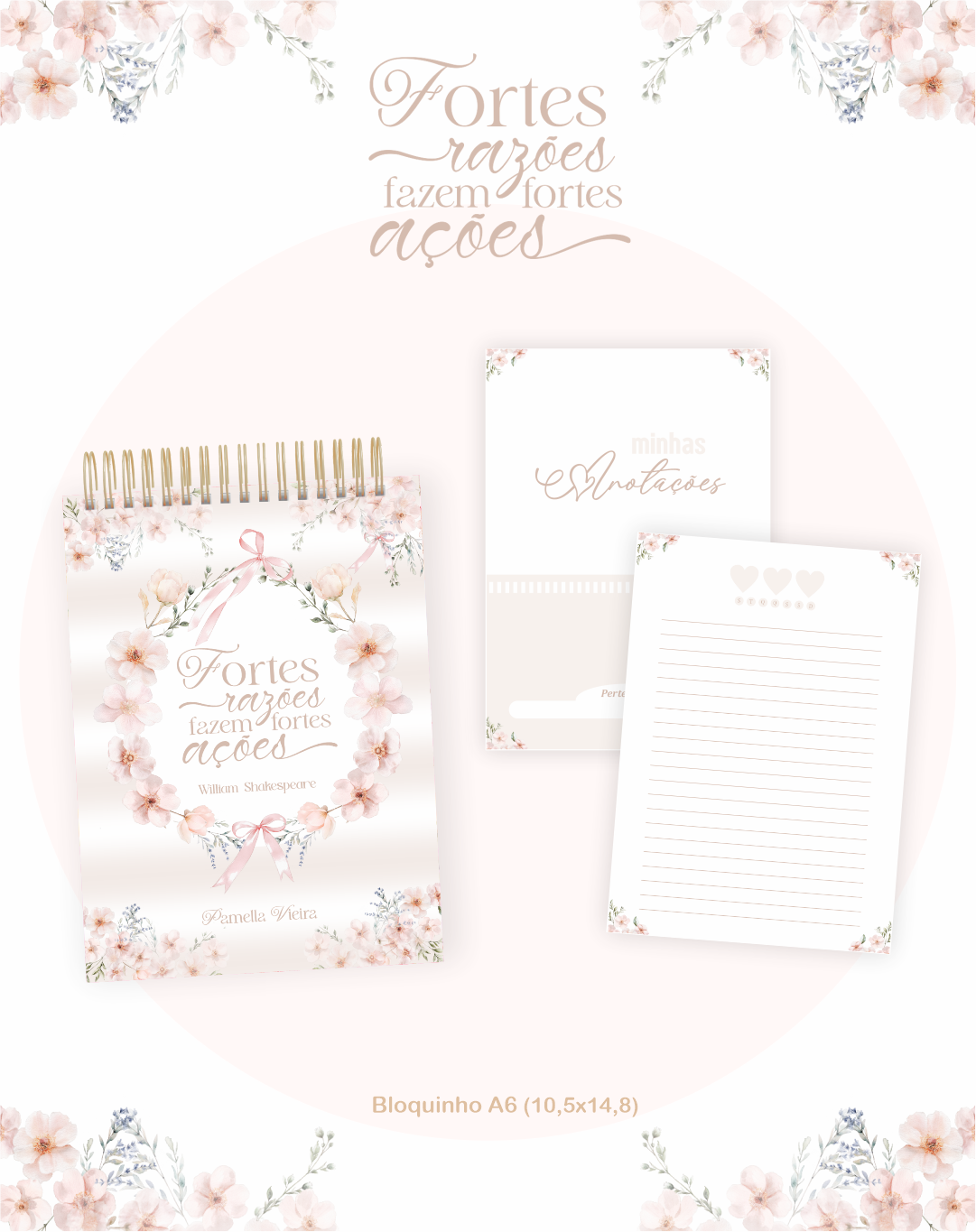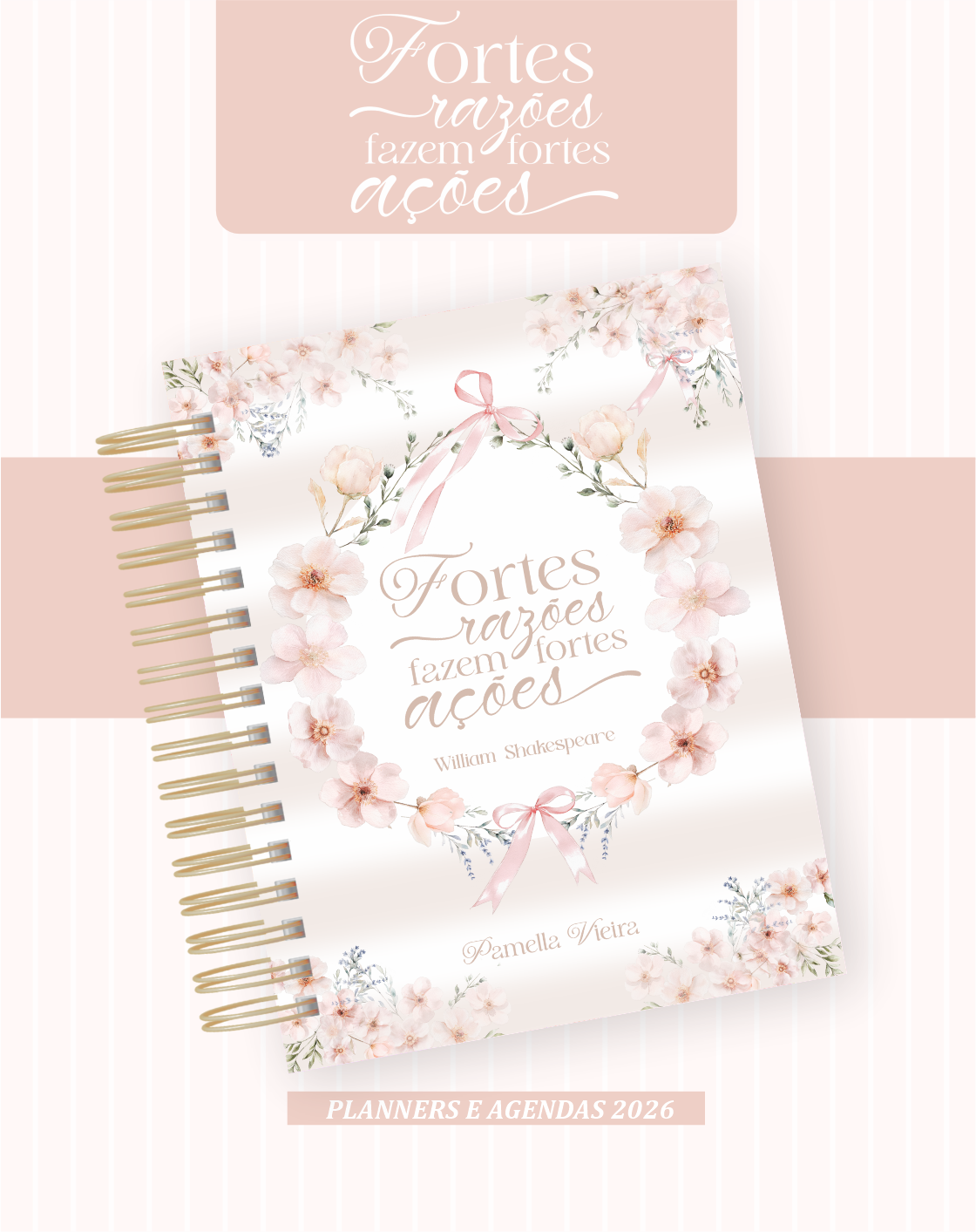 Planeje seus dias com a delicadeza das flores e a força das palavras. A linha Fortes Ações combina tons de pêssego suave, guirlandas florais e detalhes em laços para criar um refúgio de organização e beleza na sua rotina.