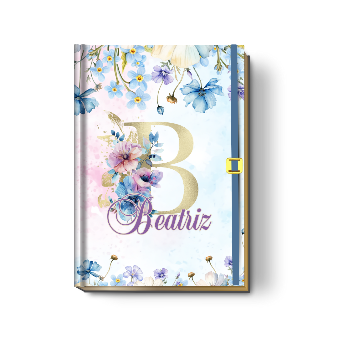 A capa dura em alta definição apresenta um design sonhador em estilo aquarela. Sobre um fundo suave em tons de rosa e azul-céu, a inicial (“B”) em dourado se destaca, adornada por um delicado arranjo de flores azuis e lilases. O nome (“Beatriz”) é aplicado em uma fonte elegante, criando um visual que transmite paz, fé e delicadeza.