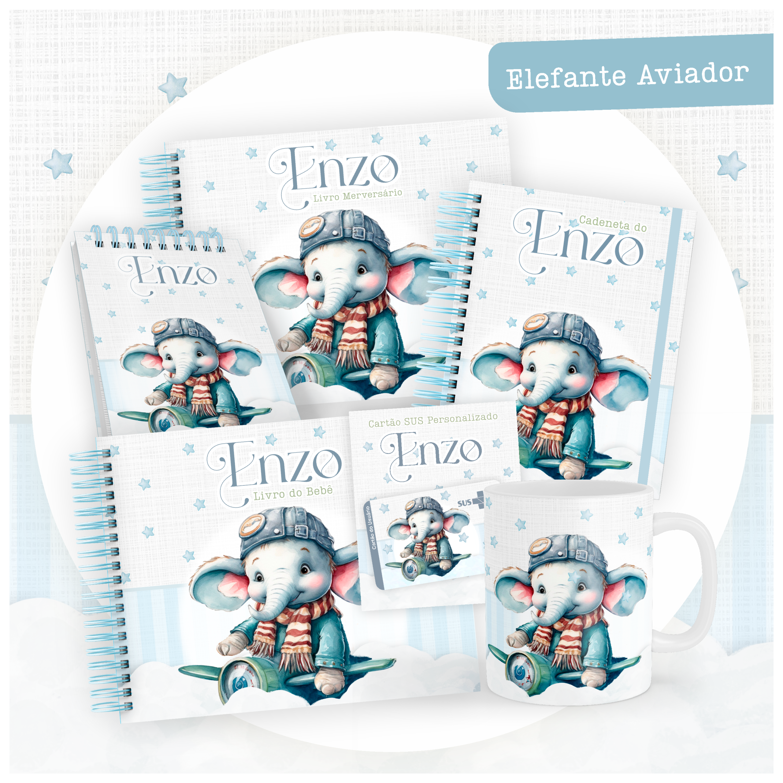Kit Faça você mesmo Livro Mêsversário Elefantinho Aviador A5 Notificações