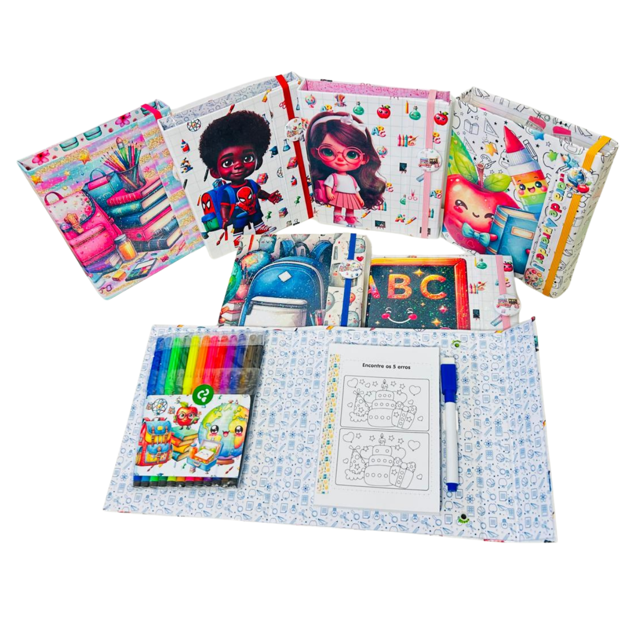 Kit Completo de Colorir: Acompanha um conjunto de canetinhas coloridas, perfeitamente organizadas em um compartimento interno, garantindo que a diversão comece assim que o notepad for aberto.